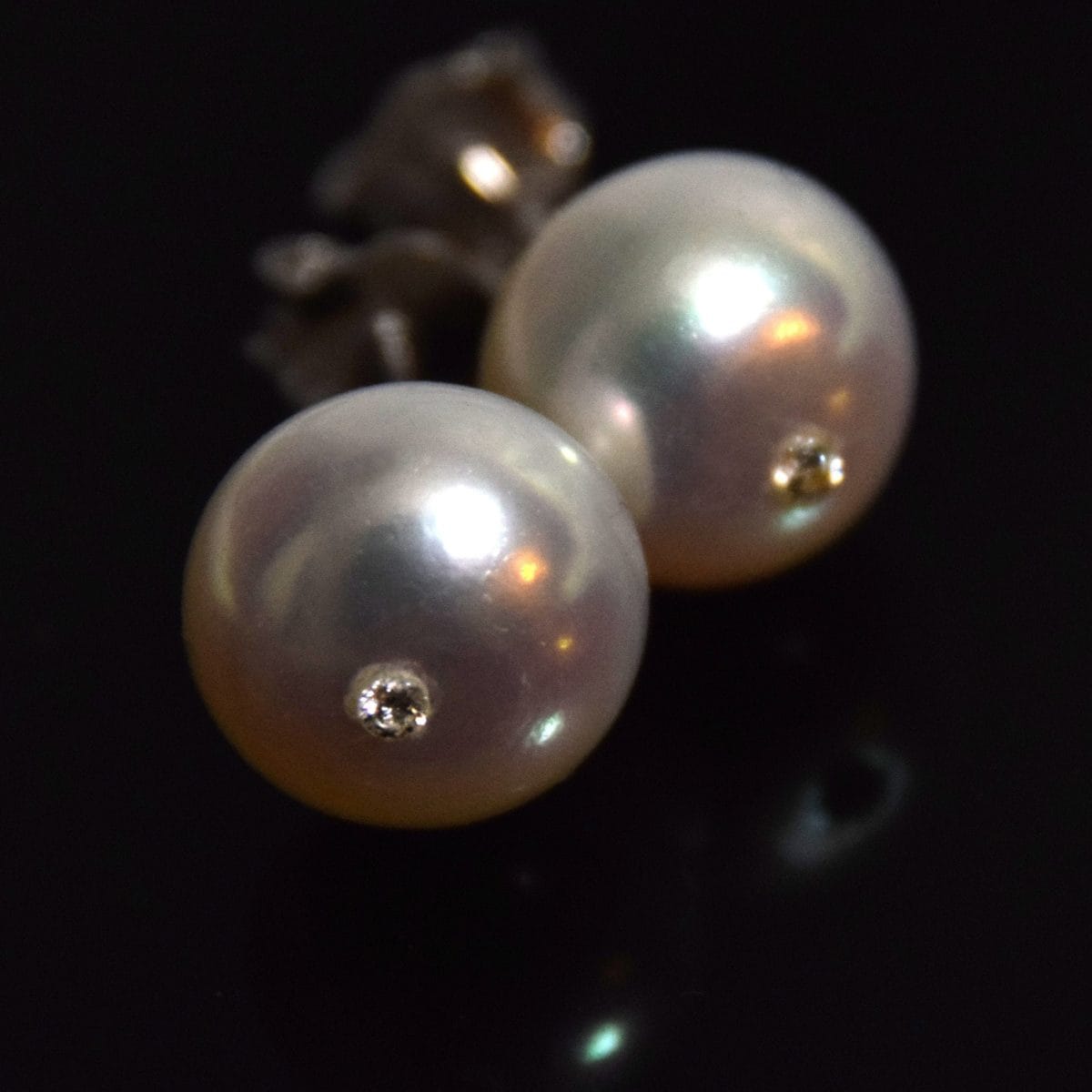 Elegant 7mm smooth white button pearl and tiny *GIA melee certified* diamond stud earrings with 925 sterling silver posts. Make an impression with the brilliant glitter of tiny 1.1mm SI grade diamonds inset into classic white button pearls.