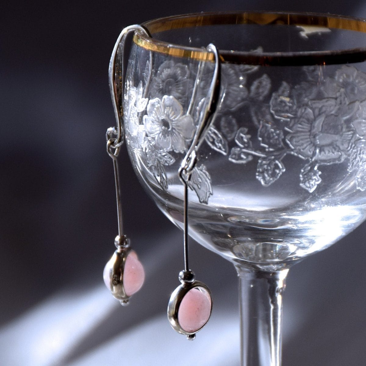 Baby pink jade sterling silver minimalist spinner drop earrings, 1.25" drop.