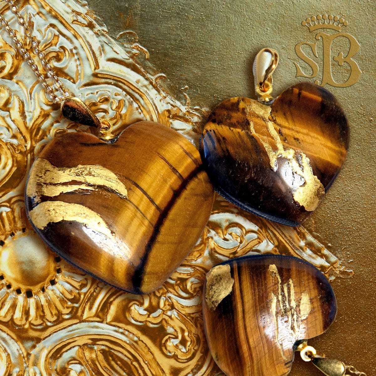 Little Tiger Eye (Gemini) heart pendants with gold leaf and vermeil gold bail. Alt June birthstone, Valentine's gift. 1" and 0.75" hearts.