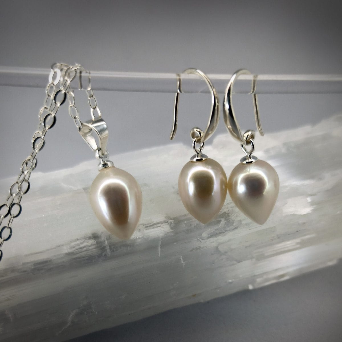 1″ full length drop earrings and 0.75″ pendant with 0.4″ (10mm) high quality freshwater pearls. You can choose the set only, or include a fine 1mm 18″ sterling chain.