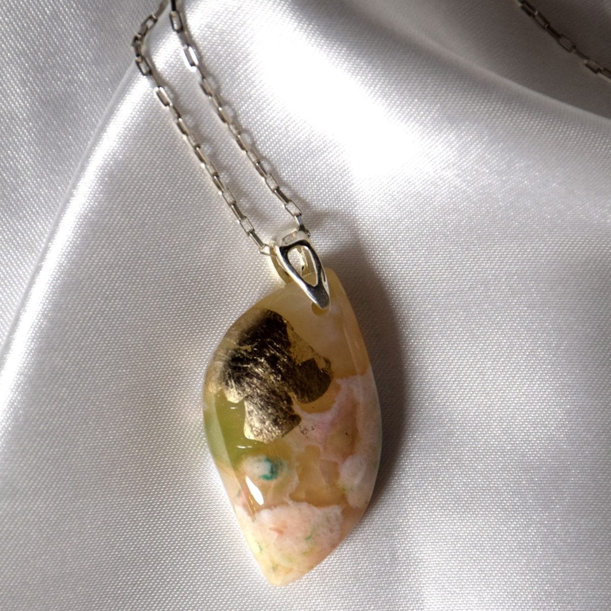 Feminine and playful translucent gold, cream and green Cherry Blossom agate pendant, 1.25″ gemstone, with total height 1.5″ with bail. The gemstone is enhanced with the warm glow of champagne (moon) gold leaf and a 925 sterling silver bail.